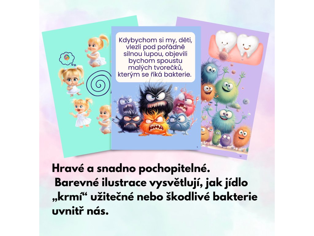 Na 30 stránkách s veselými obrázky děti poznají hodné a zlé bakterie a zjistí, co se děje v těle po sladkostech.